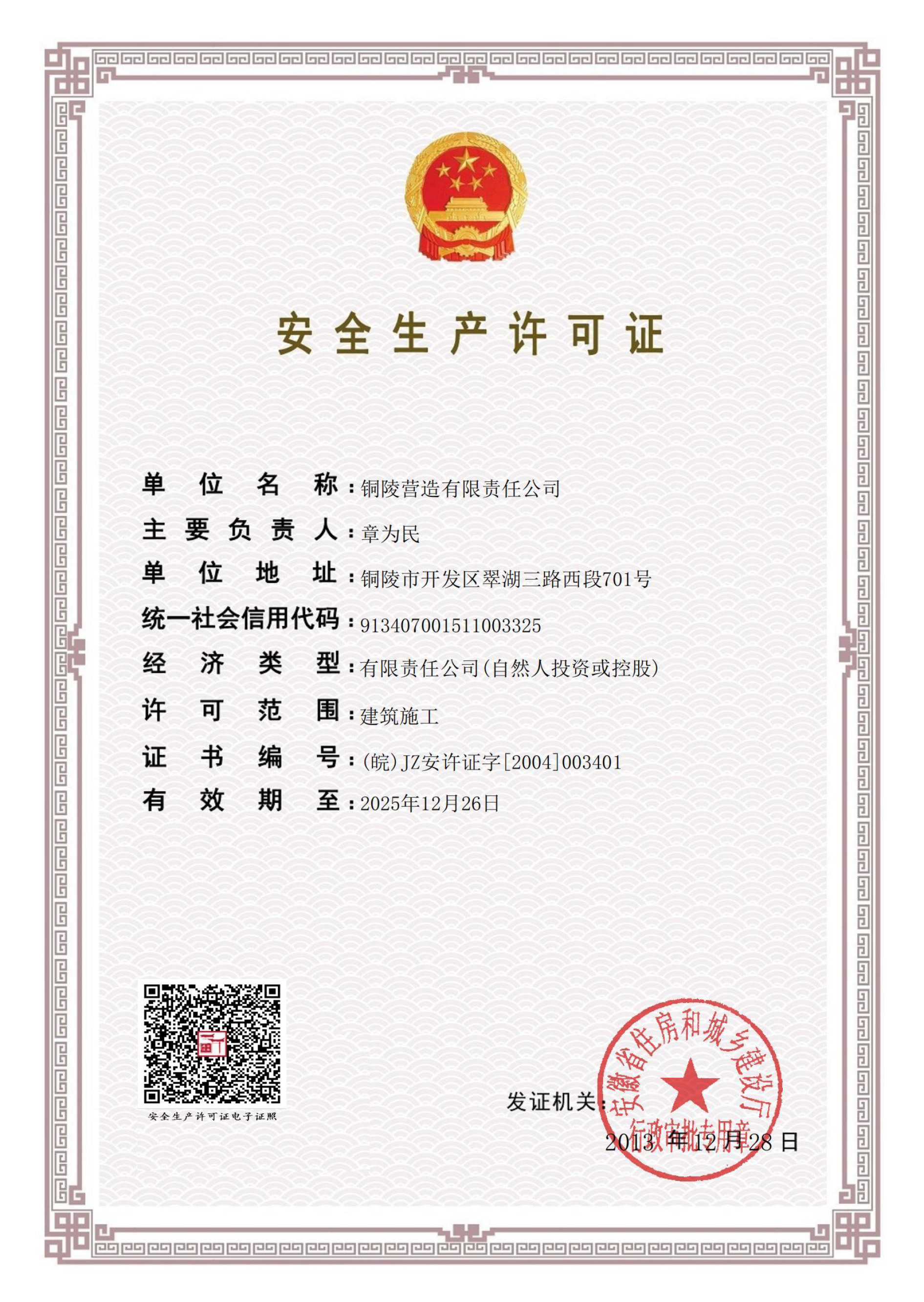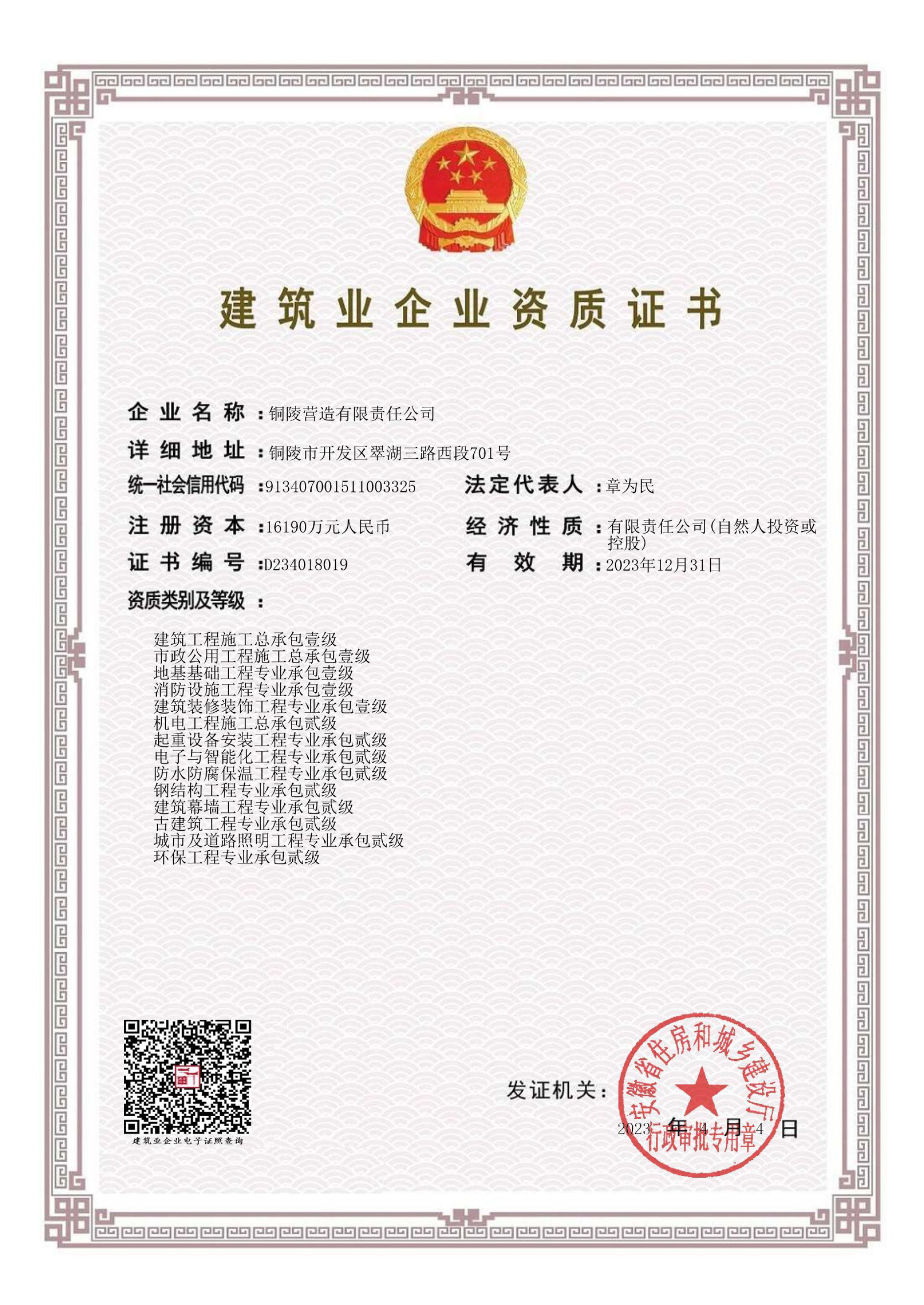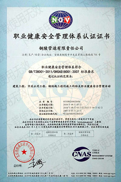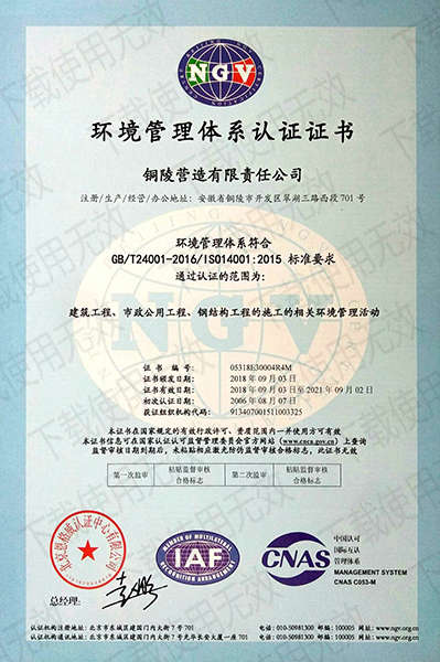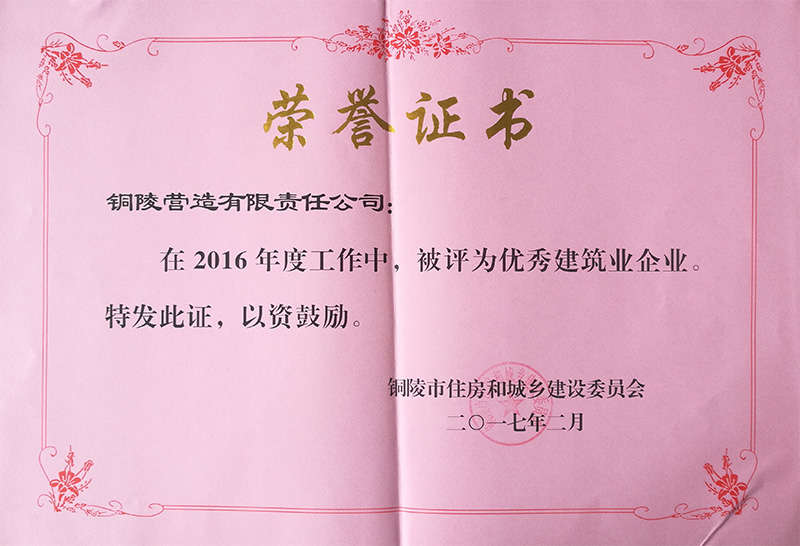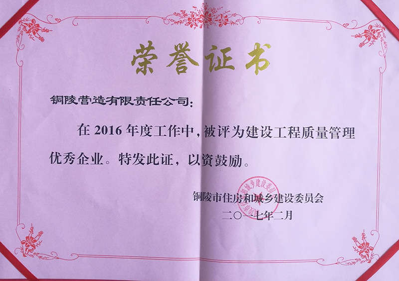 銅陵營造有限責任公司是國家住建部核準的房屋建筑總承包一級企業(yè)。2006年7月,企業(yè)二次改制為民營企業(yè),并更名為“銅陵營造有限責任公司”。目前,公司擁有房建施工總承包、市政公用工程總承包、鋼結(jié)構(gòu)專業(yè)工程承包、建筑裝修裝飾專業(yè)工程承包四項壹級資質(zhì),機電安裝、起重設(shè)備安裝、建筑幕墻三項貳級資質(zhì),地基與基礎(chǔ)一項叁級資質(zhì)。2008年通過北京恩格威ISO9001、ISO14001和OHSAS18001“三合一”體系認證。